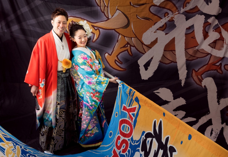 せっかくなら自分達らしくちょっとこだわりたいんですが…と相談に来たお二人。他店で相談したら「これは難しいです・追加料金になります・上司に相談してみないと…」など、あまりこちらの要望を聞いてもらえず残念だった様子。「Heroesもどこまでご希望に添えるかわからないですが、できる範囲で頑張ります」の一言が嬉しかった。と喜んでくれました。撮影当日持ち込んだよさこいの旗の大きさには本当にびっくりしましたが、今までにないカッコいい写真が撮れて私たちも嬉しかったです。結婚式に等身大の大きなタペストリーを作り会場に飾ってくれ大好評でした♡