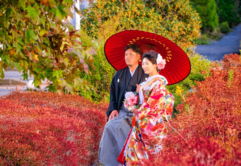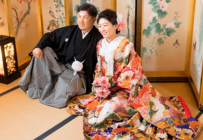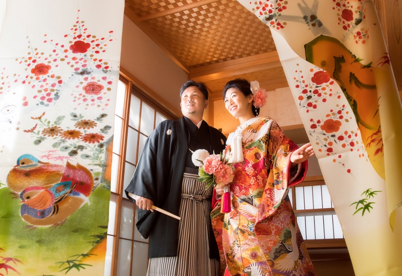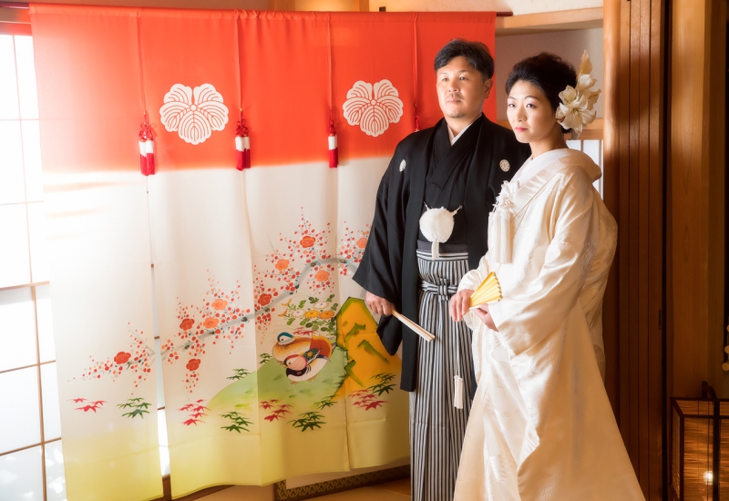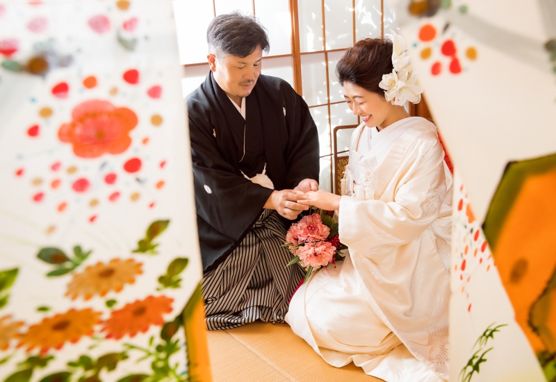 日本の花嫁にピッタリの『別館和室』には『花嫁のれん』や『結納の水引』『水合わせ』など石川県らしい伝統の花嫁道具をご用意! お庭からの爽やかな風に揺れる木々を眺め、障子に映る木洩れ陽もとても風情を感じます。最近は、お家から神様や仏様にお参りしてから花嫁姿で家を出るという風習はほとんどなくなりましたが、Heroesでは、このような伝統の儀式の意義や想いなどを大切に伝えていきたいと思っています。ご希望があれば、和室でのお仕度も出来ますし、ご自宅への出張撮影も承ります!