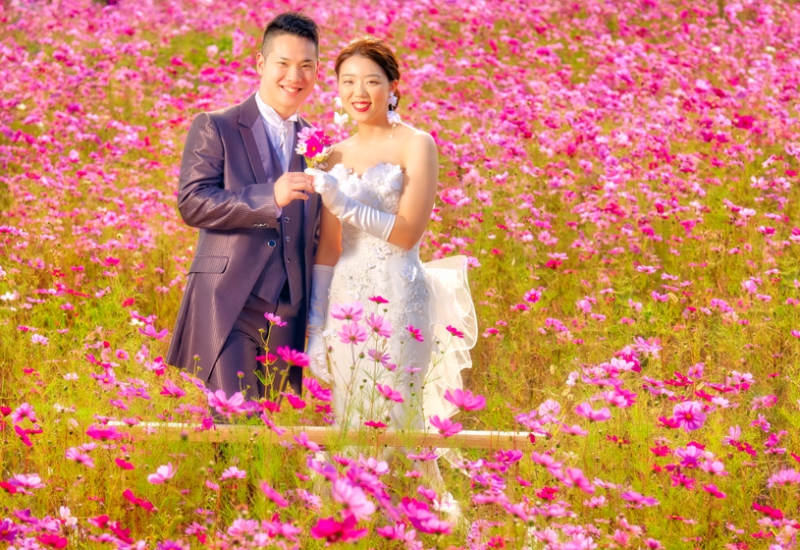 ますは、和装で近くの公園でロケ撮・別館和室でしっとり。スタジオに戻ってカラードレスにお色直し。スタジオ&ガーデン撮影をしてから、ウエディングドレスにお色直し。キャンピングカーに乗ってロケツアーに出発。コスモス畑〜海岸へ