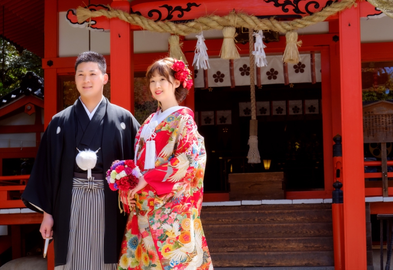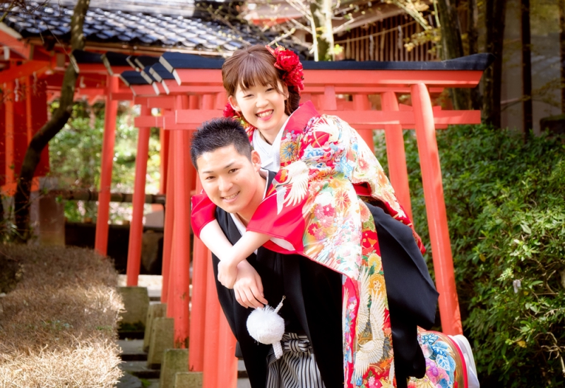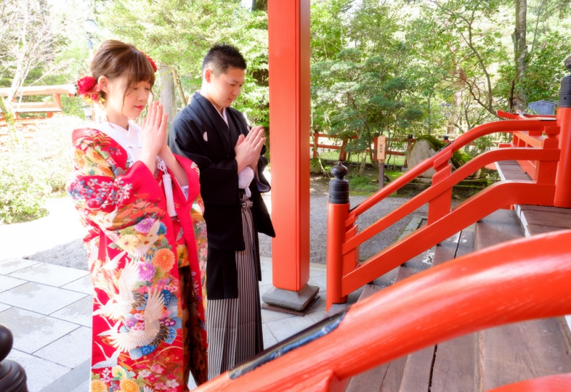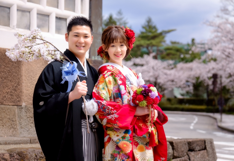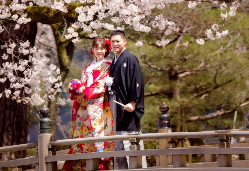 平日でも、兼六園はやはり人がいっぱい。外国人の方もたくさん花見に来ている中、撮影中も一般の人々にも囲まれての賑やかな桜ロケになりました。人気の撮影場所では、やはり写真の中には他の方々が写り込むことが多かったため、兼六園の後、カメラマンおまかせで人が少ない穴場的な場所でゆっくりと桜ロケもしました。いろんな桜ロケができて大満足のお二人でした!