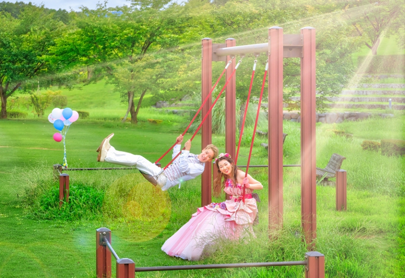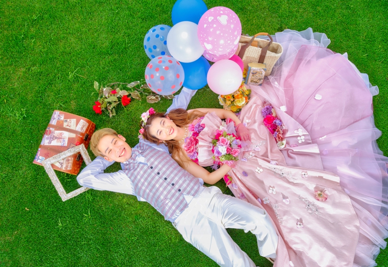親が見ていないので、手をつないでスキップしたり、ひざ枕したり、寝っ転がったり、思いっきりラブラブな自然な二人の写真が残せました。